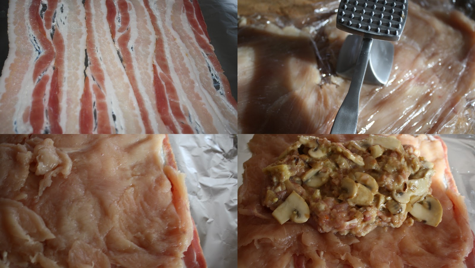 Recept nisam 100% pratio, ne zato sto znam bolje nego je tesko napraviti nesto i priblizno dobro kao sto je na njenom blogu. Ovako se rolade nece moci porediti :). Salu na stranu, razlog sto nisam stavljao pilecu kozicu kao prvi omotac je slanina koju sam koristio. Ako (slanina) nije direktno izlozena visokoj temperaturi ostane zilava i nema hrskavu koricu. Isto tako, kozica koju sam skinuo sa prsa i bataka/karabataka (nisam koristio citavo pile) nije mi izgledala bas privlacno i taj sam dio preskocio. Kada sam bio spreman da filujem roladu, nisam mogao da odolim a da ne dodam i sampinjone u fil, tako da cu ovaj post iskoristiti i kao jos jednu ulaznicu za novembarsku igru ajme, koliko nas je, pokrenuta by Monsoon, a pecurke kao temu je zadala Lusitania sa bloga na putovanju.