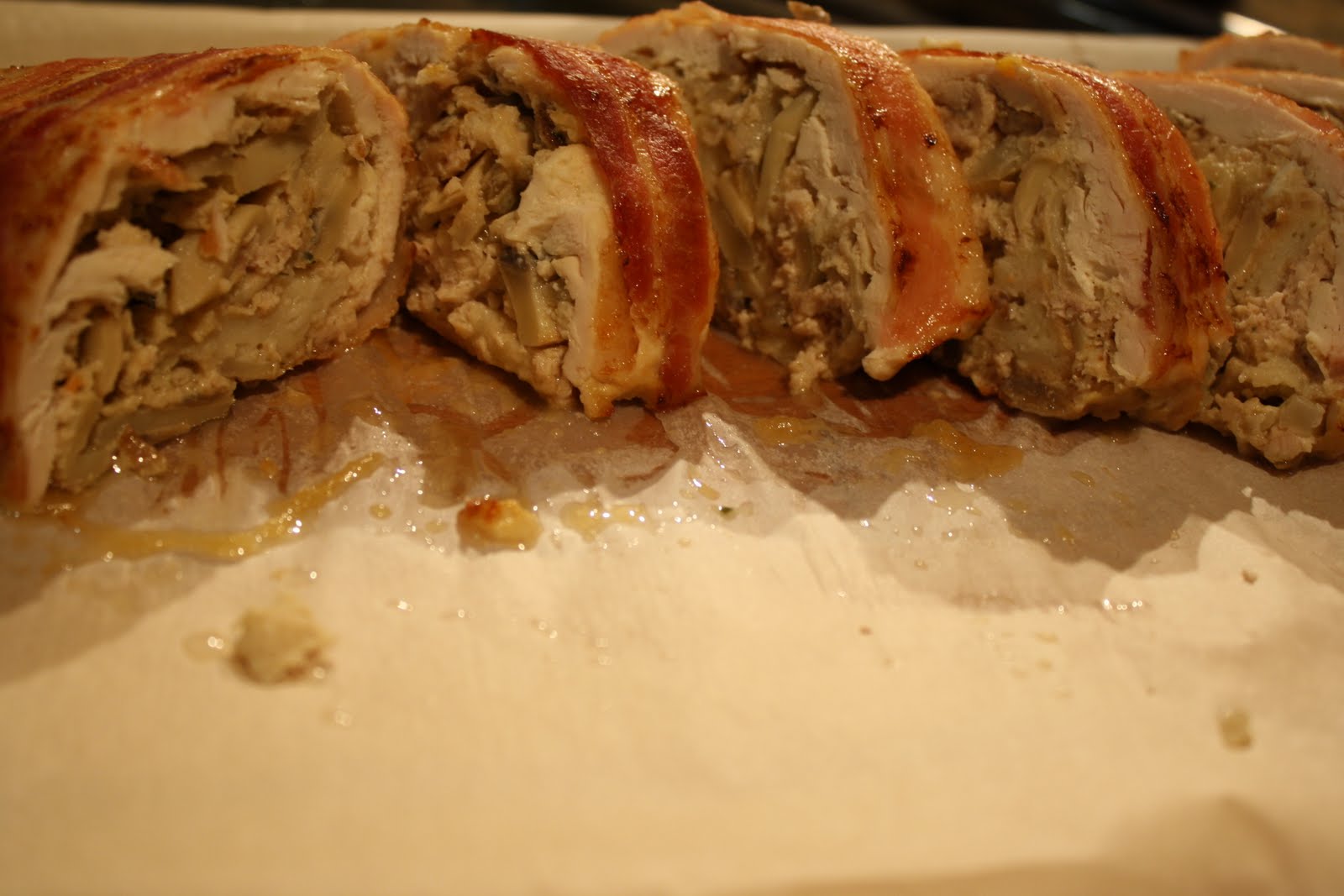 Odlicno si se snasao i mogu ti reci da je ova tvoja varijacija vrlo uspesna, trakice od slanine su dobile lepu hrskavu koricu a dodatak sampinjona je obogatio nadev...cista petica za ideju i izvedbu!;)))