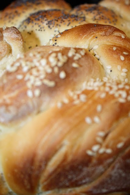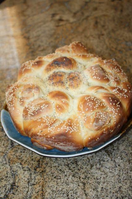 8. Sloziti u podmazanu i pobrasnjenu tepsiju. Premazati mlijekom, posuti susamom i makom. Upaliti rernu na 200°C, pa kada se rerna ugrije, peci pogacu 35-40 minuta. Zadnjih 15-tak minuta pokriti aluminijskom folijom.